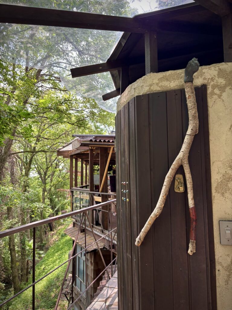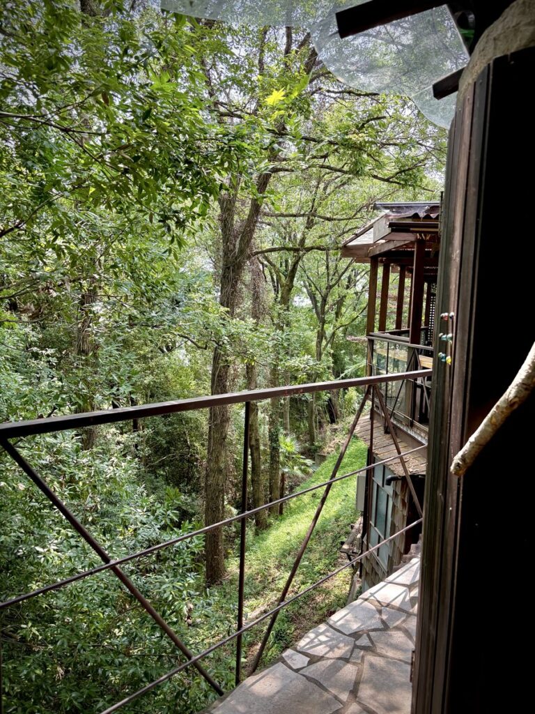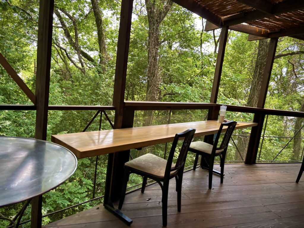テラス席は、森に溶け込むようなデザインで、眼下には深い森、どこを切り取っても絵になる空間