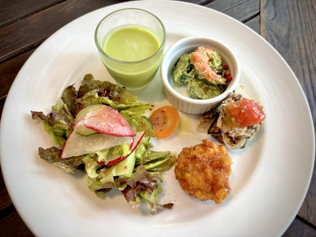 フレッシュで瑞々しいサラダやバジル香るエビサラダ、どれも軽やかでほっとする味です