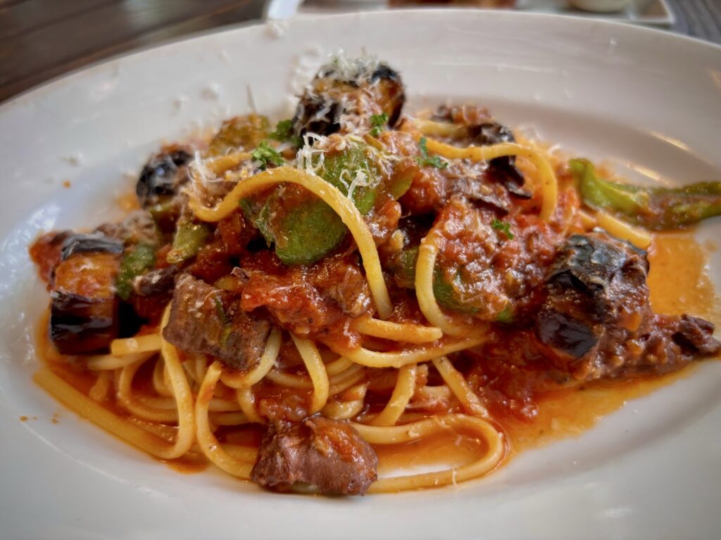 私は牛すじと夏野菜のトマトソース、リングイネ