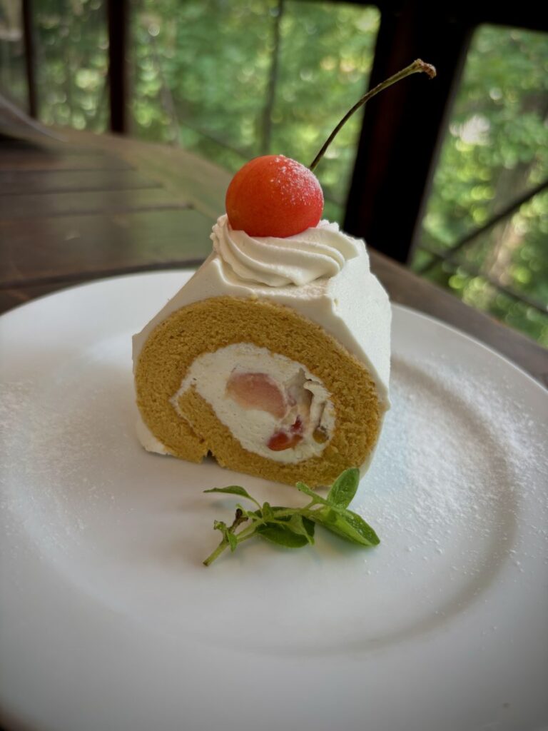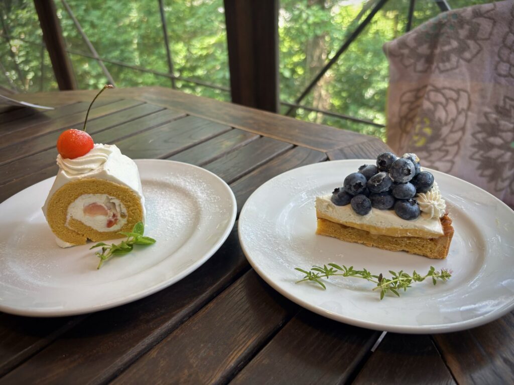 デザートは、さくらんぼロールケーキとブルーベリータルト