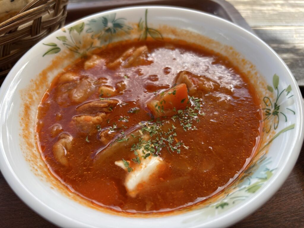 ボルシチは、お肉はほろほろ、お野菜はすっかり煮込まれてとろりと溶け合い、スープに甘味と深みがあり美味しい