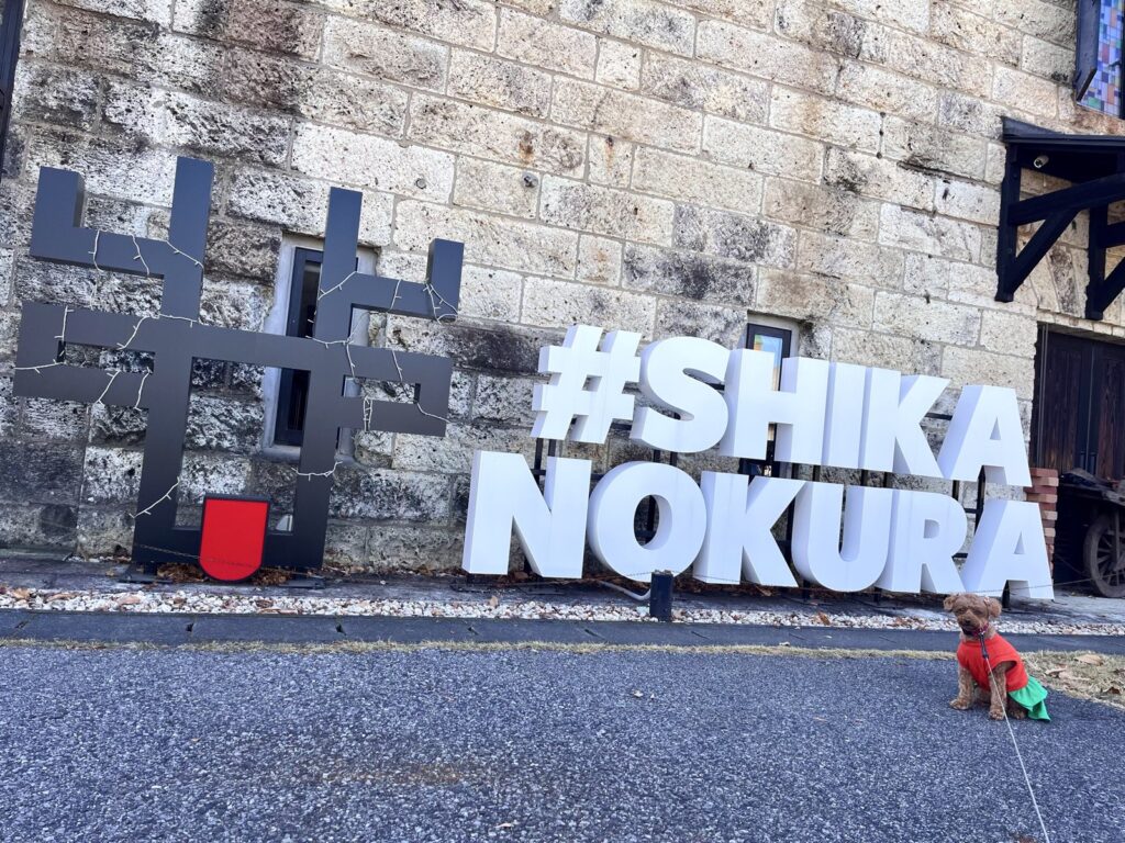重厚な石蔵とポップなお店のオブジェの前でこむぎと記念に一枚