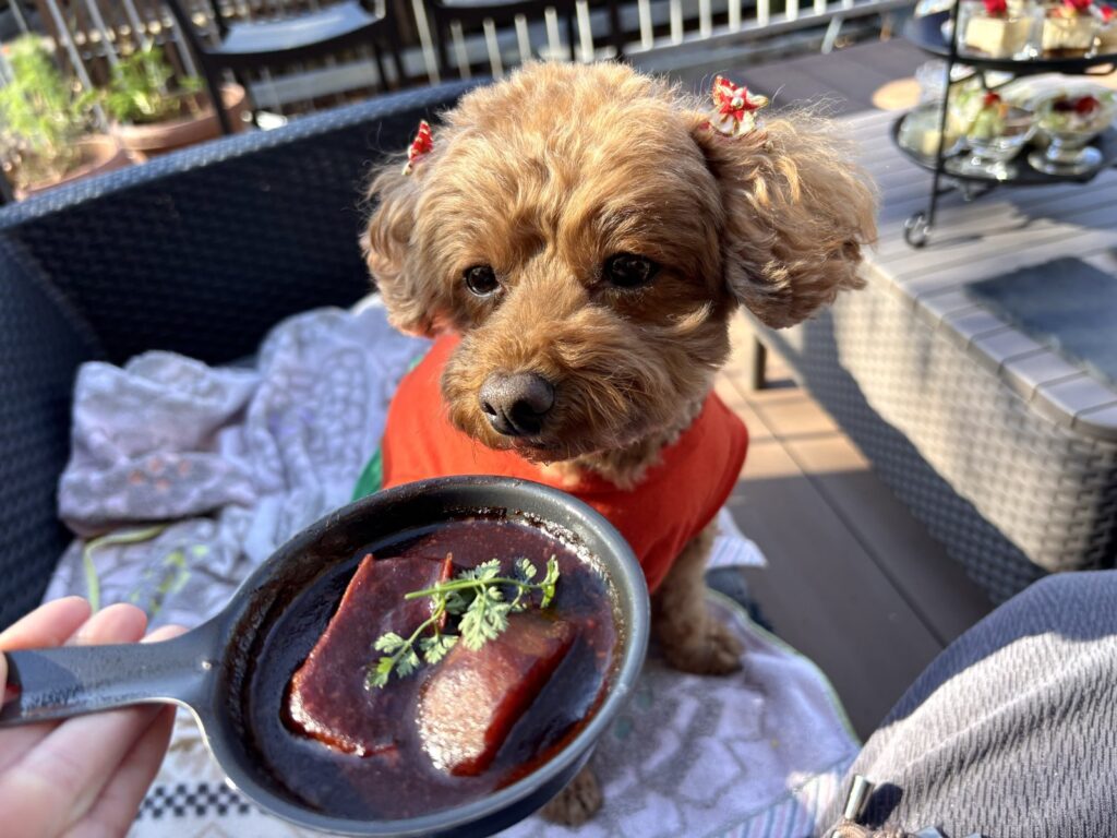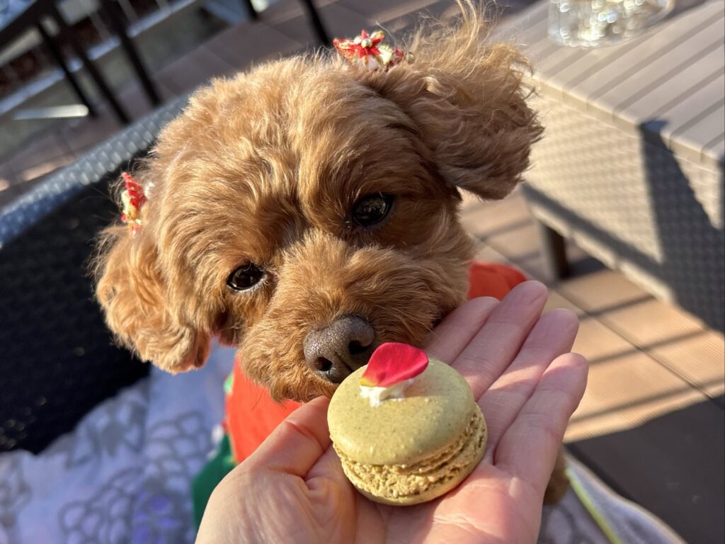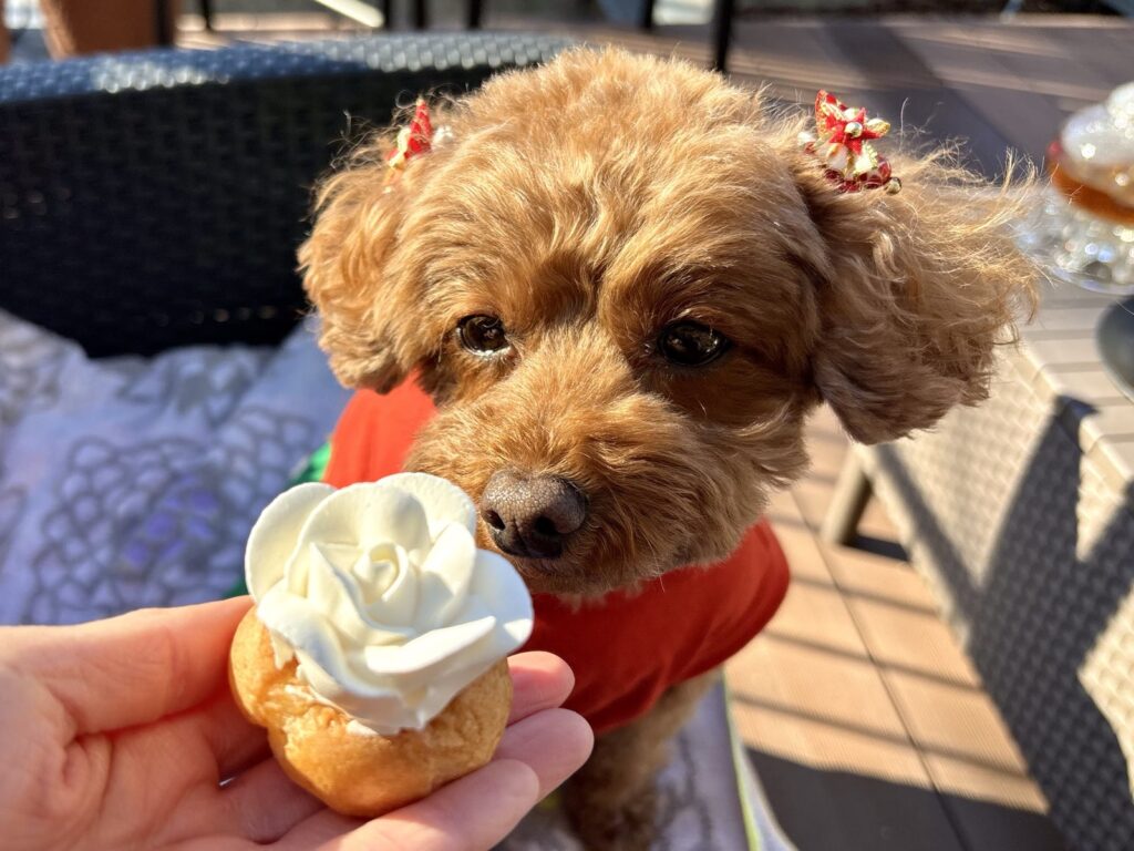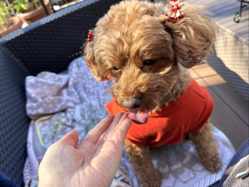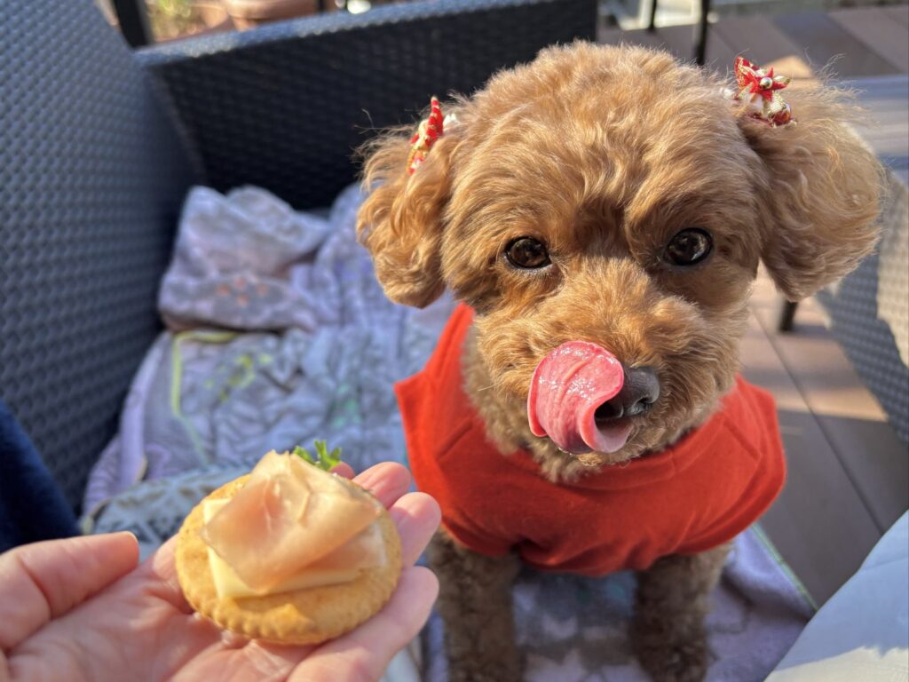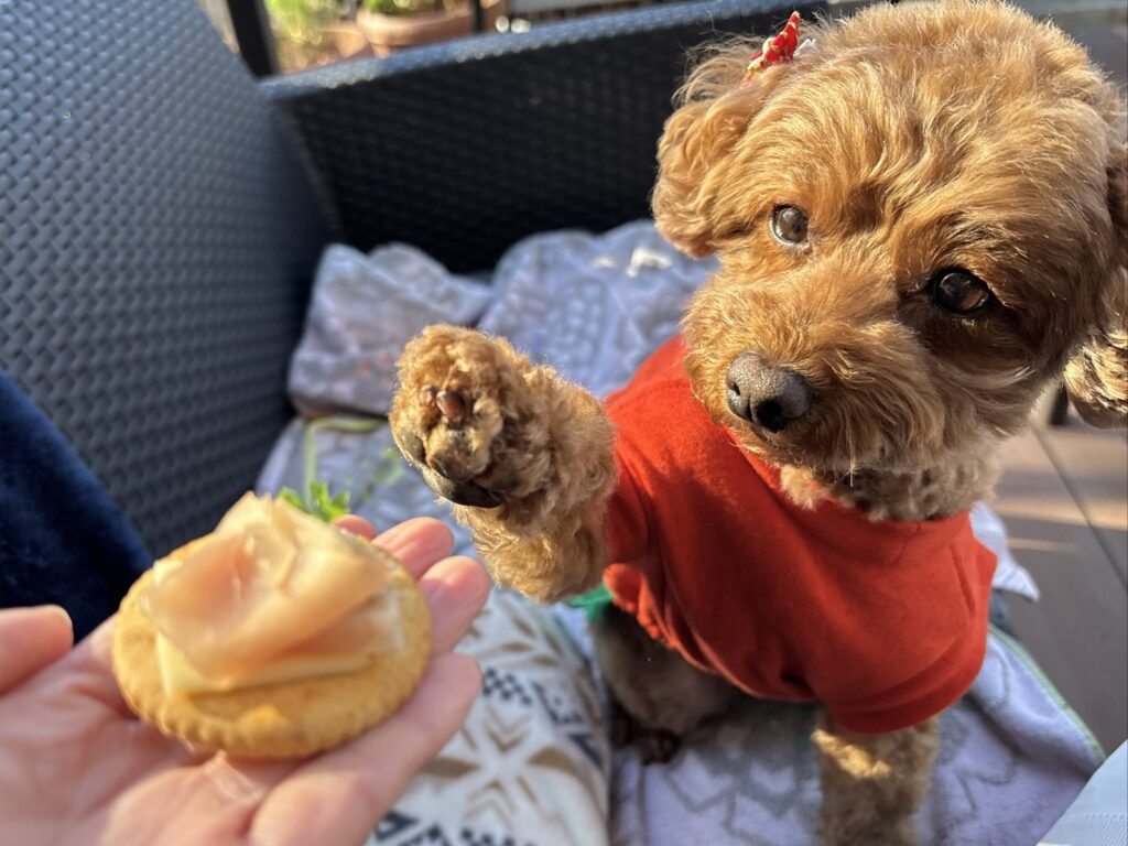 持参したわんこ用おやつの中にちょうどヤギミルクチーズがあったので、こむぎもおやつタイム