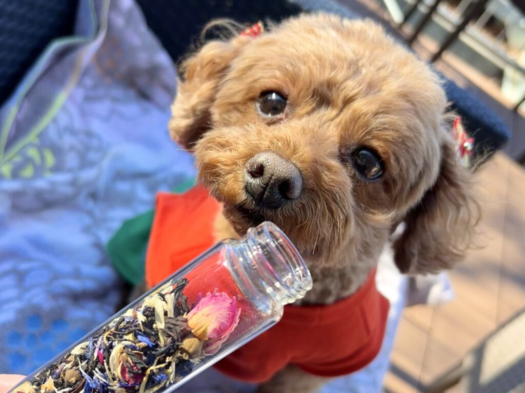 こむぎは漂うローズやジャスミンの香りに興味津々