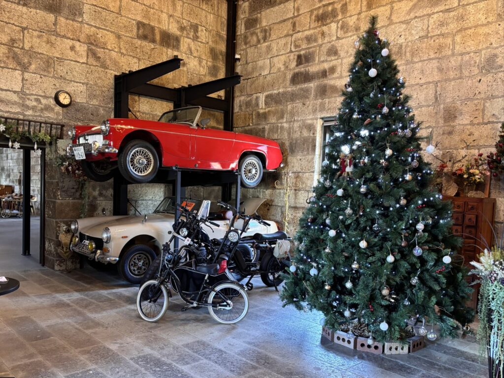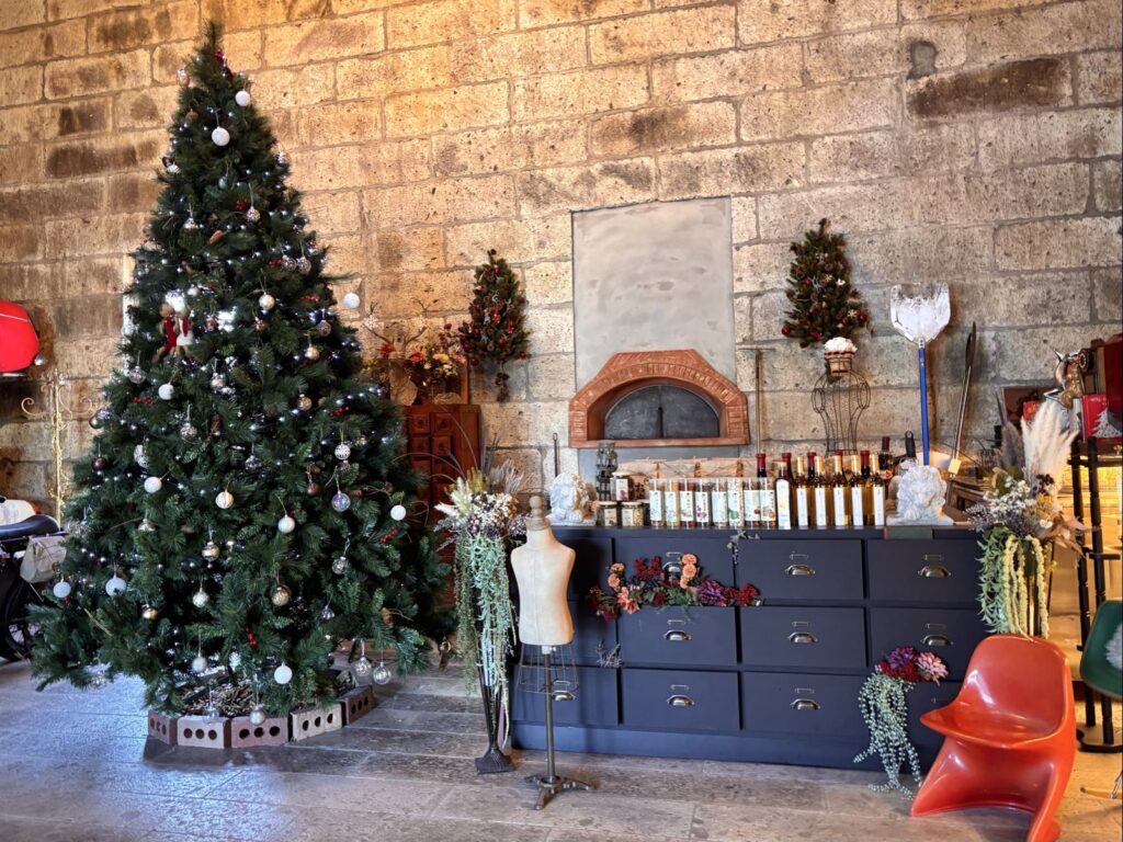 石蔵の趣ある雰囲気と大きなクリスマスツリーが静かに華やかに調和していて素敵