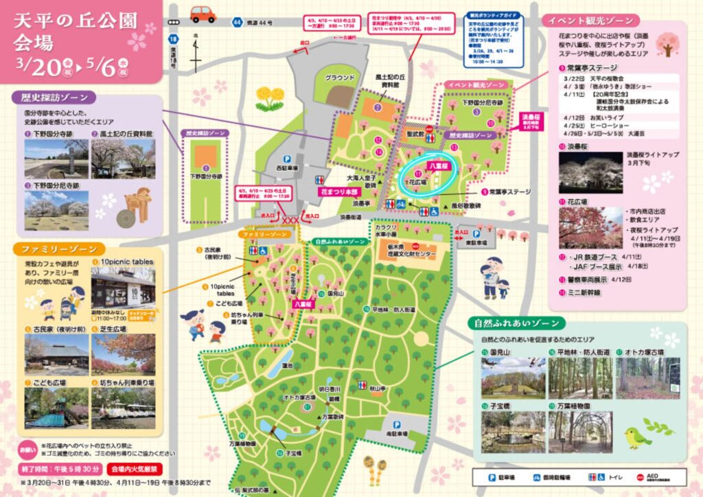 天平の丘公園では、春になると花まつりが開催され、園内は一気に華やかな雰囲気になり、花まつり期間中は17万人が訪れる大人気の春の名所