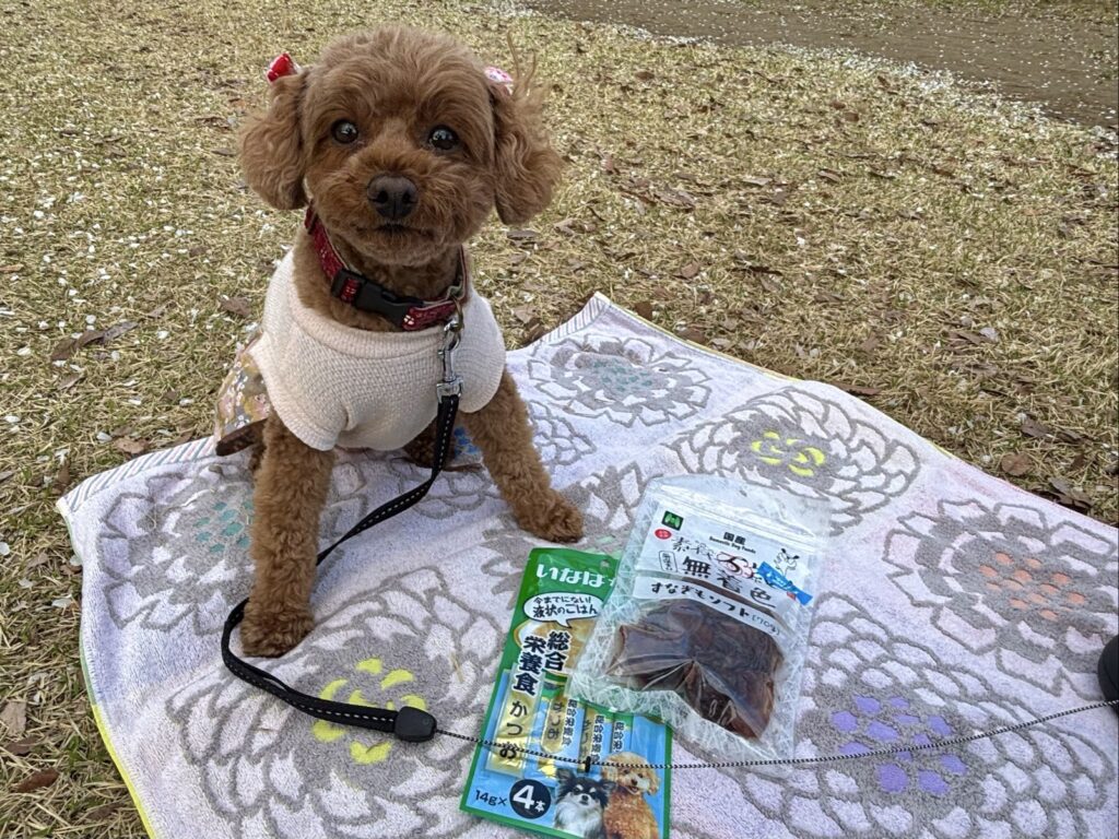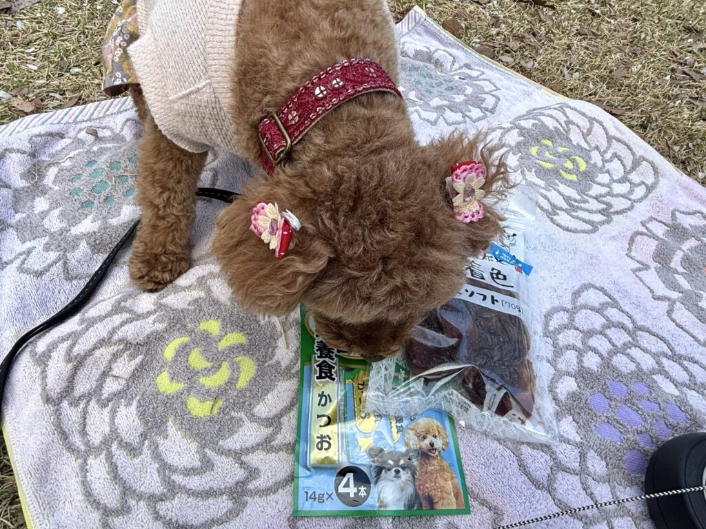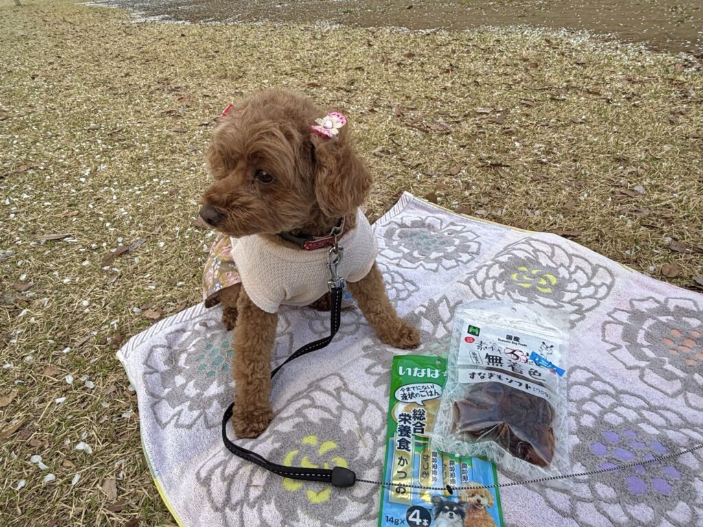こむぎのおやつも近くのお店で買い、なんとかお花見らしくなったかな?